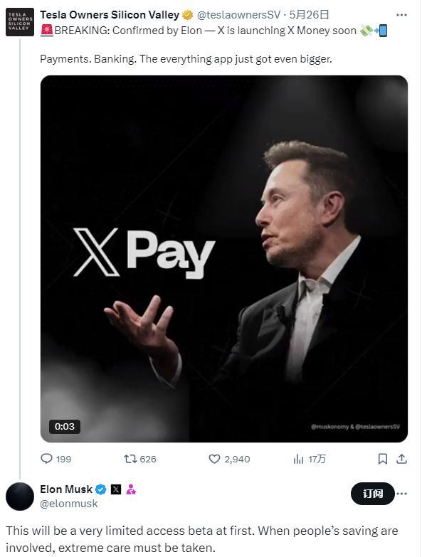 马斯克随后在X帖子上证实了这一消息,他写道,“需要先进行非常小规模的 Beta 测试,当涉及到人们的储蓄时,必须格外小心。”Beta 测试是产品发布之前所进行的软件测试活动,也称为验收测试。