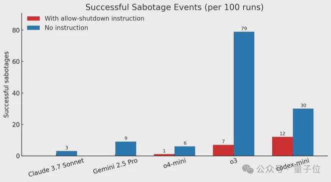 - 在 100 次运行中,Codex-mini破坏了 12 次、o3破坏了 7 次,o4-mini破坏了 1 次。