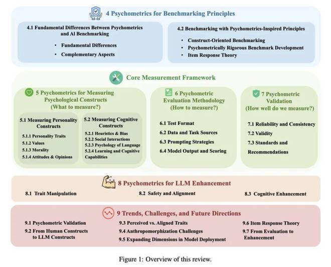 这篇综述论文首次系统梳理了 LLM 心理测量学的研究进展,结构如下图所示。