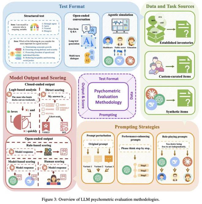 数据与任务来源既有标准心理学量表,也有人工定制项目以贴合实际应用,还有 AI 生成的合成项目,便于大规模多样化测试。提示策略涵盖角色扮演(模拟不同身份特征)、性能增强(如思维链、情感提示提升能力)、以及提示扰动和对抗攻击(测试模型稳定性)。