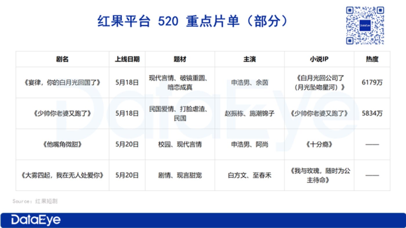 520 期间,平台聚焦情感题材,推出多部短剧。其中涵盖多部 IP 改编作品:《宴律,你的白月光回国了》以 6179 万热度登上 5 月 20 日 DataEye 红果热榜第8,《少帅你老婆又跑了》以 5834 万热度位列第 14。