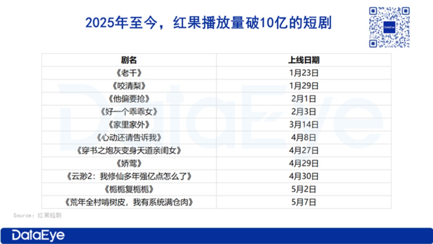 在红果平台,播放量破 10 亿是衡量短剧爆火的关键指标。2025 年以来,平台爆款短剧的产出效率大幅提升,已有 11 部作品突破 10 亿播放量,相比往年明显缩短。