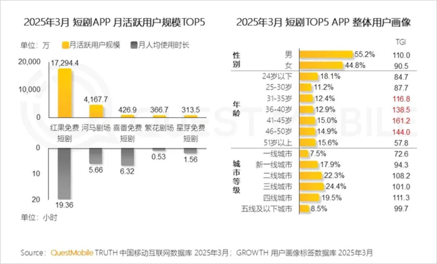 用户画像显示,3 月短剧行业 TOP5 APP 中,35 岁以下用户(90 后、00 后)占比超 40%;45 岁以下用户(80、90、00 后)占比接近 70% ,短剧内容对中青年群体的强吸引力有所增强。