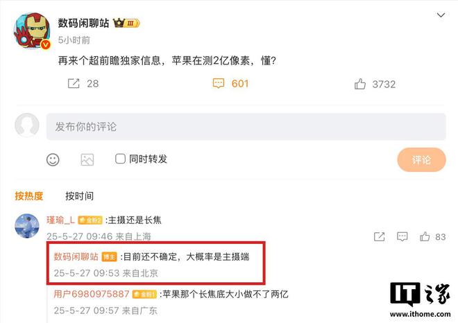 IT 之家 5 月 27 日消息,博主@数码闲聊站发文,透露苹果正在为 iPhone 测试 2 亿像素相机传感器,该博主同时在评论区透露相应传感器“大概率用于主摄端”,考虑到目前 iPhone 17 机型大致设计已板上钉钉,预计这一“2 亿像素传感器”将应用于明年(2026 年)的 iPhone 18 或者 2027 年的 iPhone 19。