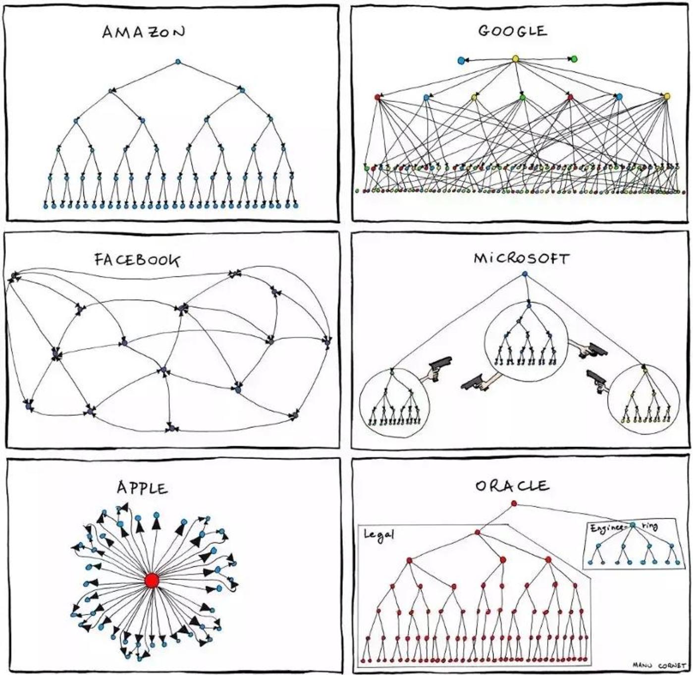 另一个成功“再造”的经典样本是微软。曾经,微软也被大公司病困扰——内斗严重、信息壁垒林立,一幅著名的讽刺漫画形象描绘了微软各部门“互相瞄准”的局面。