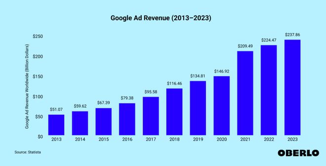 2023 年,在其 2379 亿美元的广告总收入中,高达 1750 亿美元(占比 73.6%)均源于谷歌搜索业务。