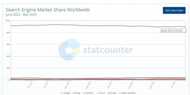 如今,谷歌在搜索市场份额现已跌破 90%,并且还在快速下滑。