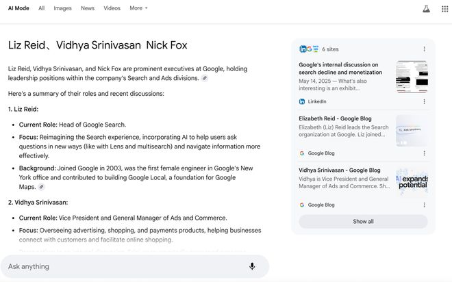 一份涉及 Liz Reid、Vidhya Srinivasan 和 Nick Fox 等高管的内部会议纪要,揭示了核心判断: