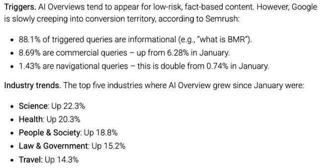 3. 触发 AI Overviews 的导航类查询数量自 1 月以来翻了一番——从 0.74% 增至 1.43%。也就是说,即便是品牌自身的流量也岌岌可危。