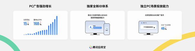 为此,腾讯应用宝大力推动了 PC 跨端的商业化基建工作,包括建立独家 ID 体系、与腾讯广告合作建立独立 PC 场景投放能力、推动大量 CP 整合登录支付功能、上线 APK 及电商广告等。
