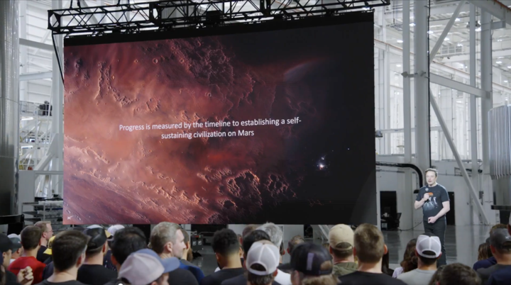我们的进展,用一个标准来衡量,就是实现一个在火星上能够自我维持的文明所需要的时间。而星舰的每一次发射,尤其是在早期阶段,都是在不断学习和探索,为让人类成为多星球物种打基础,让星舰不断完善,最终能够将成千上万、甚至上百万的人送往火星。