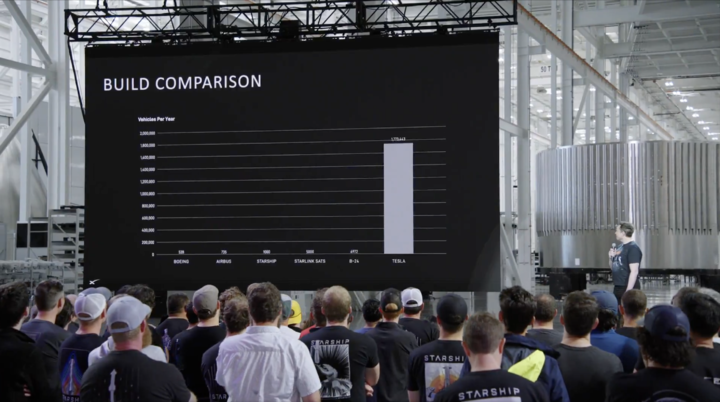 这些对比有助于我们建立一个概念:其实制造大量用于星际旅行的星舰是可行的。即使从总吨位的角度来看,像特斯拉和其他汽车公司依然在制造比 SpaceX 更复杂、产量更高的产品。