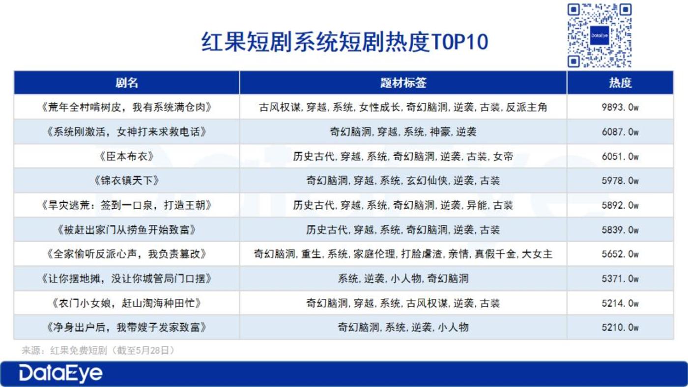 DataEye 统计了近期在红果免费短剧上爆火的系统微短剧 TOP10。从表中可以看出热度较高的系统微短剧有如下共性。
