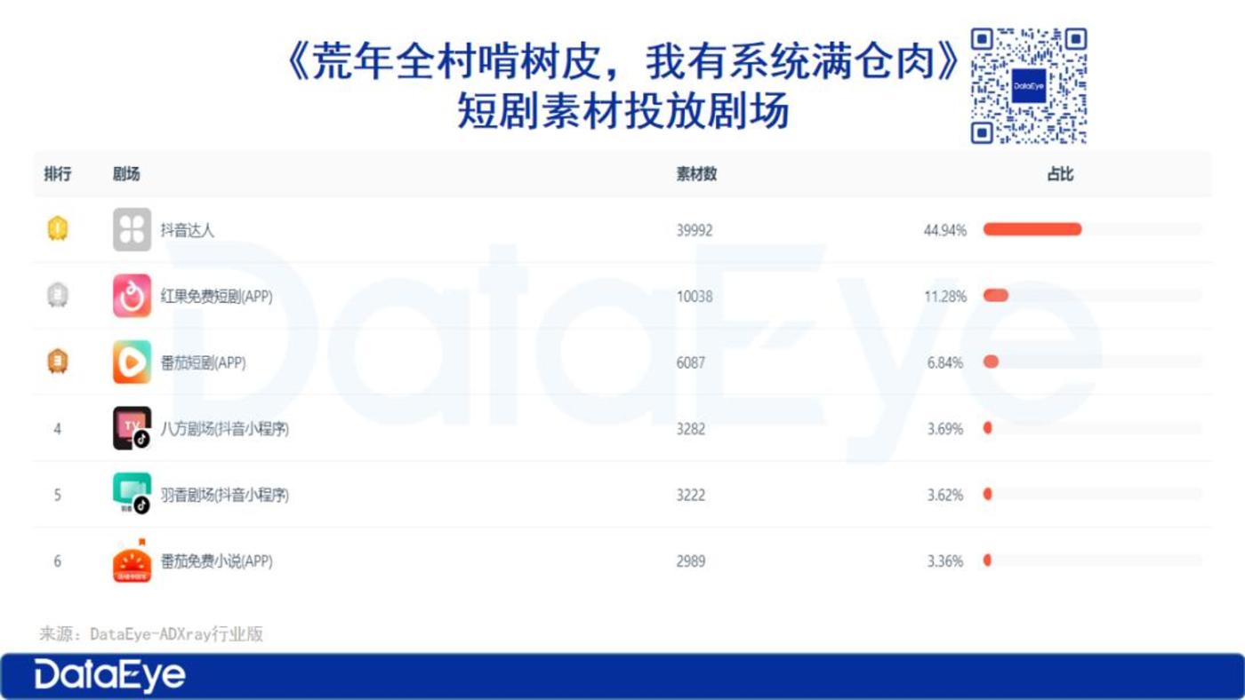 从 ADX 数据看,《荒年全村》上线以来,除了抖音达人的推广外,红果免费短剧和番茄短剧的投放量占 TOP2,番茄免费小说的投放排名也位列第六。可以看出,《荒年全村》的多数投放量都导流到免费的红果或番茄这两个小说与微短剧生态共存的 APP 中。