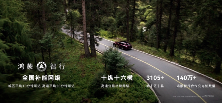 余承东为了打消车主们的续航焦虑,特意在发布会上提到了鸿蒙智行目前已经建成了十纵十六横的高速公路补能网络,覆盖了 3100 多个区县,鸿蒙智行合作的充电桩数量则来到了 140 万根以上。