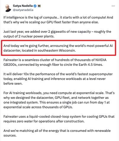 微软总裁纳德拉也在社交媒体上直言将在威斯康辛州建造“世界上最强大的人工智能数据中心”。