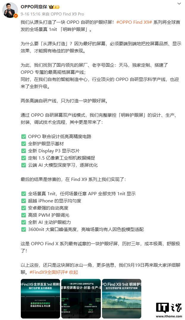 他透露,OPPO 通过自研屏幕双产线模式,完全掌握“明眸护眼屏”的设计、生产、封装、调试技术全流程,带来低亮高精度电路、全新护眼基材、新 Display P3 显示芯片等技术,在 OPPO Find X9 系列手机上实现了很多效果,IT 之家附上详情如下:
