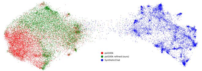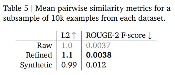 研究者使用了 ROUGE-2 和嵌入余弦距离指标比较 pol100k、精炼版和 SyntheticChat。