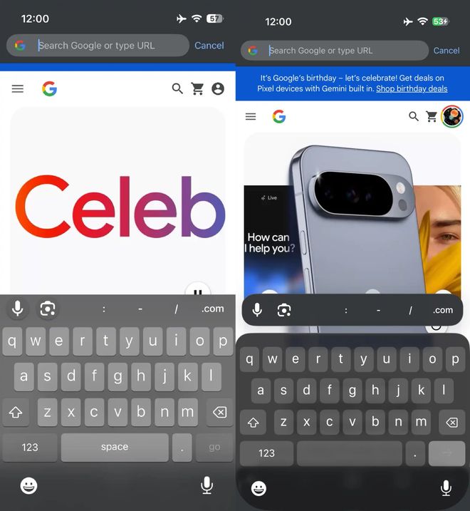 此外,iOS 26 引入了全新键盘设计,整体界面更圆润。Chrome 依旧提供额外的功能按键,包括语音搜索、Google Lens 以及“.com”和斜杠等快捷输入,不过这些按键如今以悬浮矩形条的形式显示在主键盘之上。