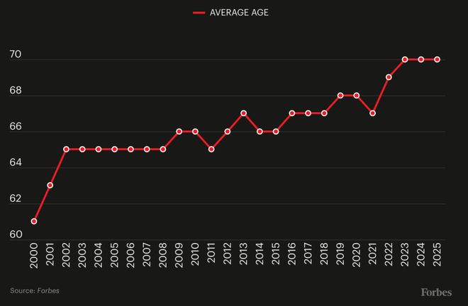 过去 25 年间,福布斯 400 富豪榜成员的平均年龄从 61 岁攀升至 70 岁,比 39 岁的美国人平均年龄整整大了三十岁。