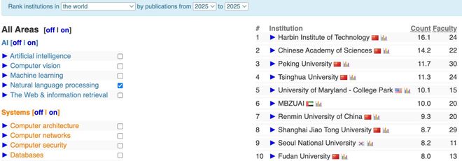 在 AI 大类中选择「自然语言处理」方向,全球前十的高校是哈尔滨工业大学、中国科学院、北京大学、清华大学马里兰大学帕克分校、穆罕默德·本·扎耶德人工智能大学、中国人民大学、上海交通大学、首尔大学、复旦大学。