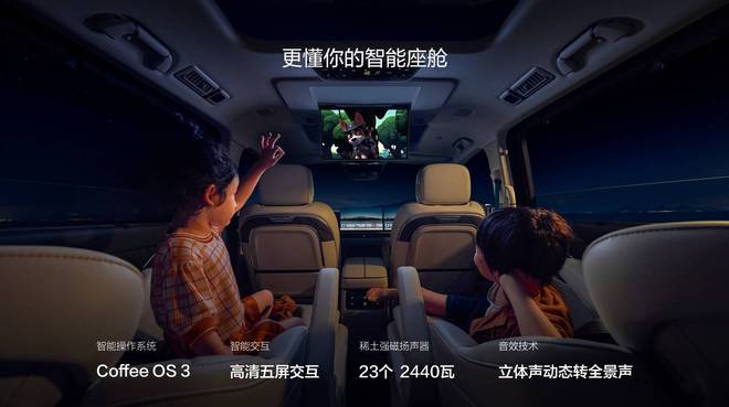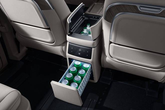 23 扬声器、12.5 L 车载压缩机冰箱、二三排遮阳帘、三温区自动空调、负离子空气净化等功能也一应俱全。