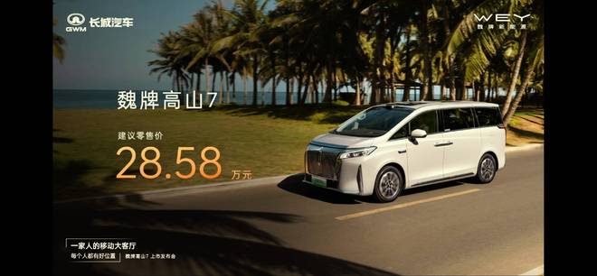 魏牌高山 7 仅有一个版本,售价 28.58 万,比预售价低了 4000 元,可以选装 8000 元的双实体按键悬浮式零重力座椅和 2000 元的铝合金多幅溅镀轮辋。