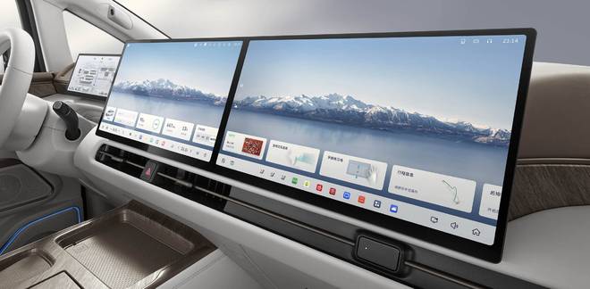 新车座舱的核心理念是「AI 智慧空间」,一共配备了 3 块大屏,中控及副驾屏采用双 15.6 英寸超高清联屏,后排则是一块 17.3 英寸的超高清吸顶屏,座舱采用最新的车规级 8295 芯片,配备 24GB 内存与 256GB 存储。