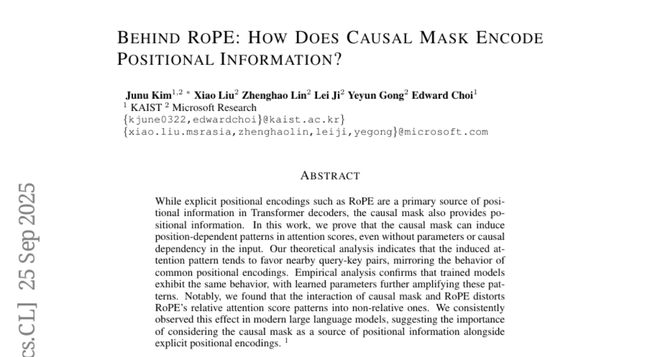 A:研究发现当 RoPE 和因果掩码同时存在时,因果掩码会"扭曲"RoPE 的相对位置注意力模式,使其变成非相对的模式。这就像原本精确的尺子被有色眼镜扭曲了,导致 AI 对位置距离的感知产生系统性偏差,可能影响模型处理长文本的能力。