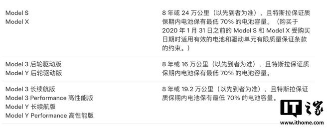 IT 之家注意到,根据特斯拉中国的规定,Model 3 / Model Y 在 8 年或 16 万公里内、Model 3 长续航 / 3P 及 Model Y 长续航 / YP 在 8 年或 19.2 万公里内、Model S / X 在 8 年或 24 万公里内,如果电池衰减超过 30%,且损坏原因“不是人为造成的”,可以申请免费更换电池。