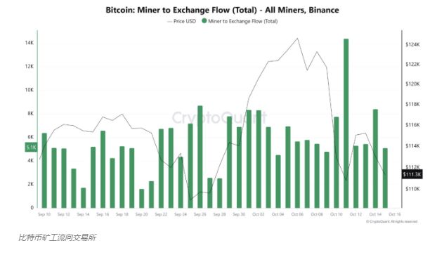 与此同时,矿工的动向也引发了市场的警觉。根据 CryptoQuant 的数据,自 10 月 9 日以来,矿工地址已向币安交易所存入了约 51000 枚比特币。这一自 7 月以来最大规模的资金流入交易所的行为,从历史上看,往往发生在价格疲软之前。