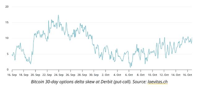 最新的市场动态显示,交易员正为潜在的更多下行风险做准备。据 Cointelegraph 今日报道,比特币期权市场的一项关键指标“delta skew”已攀升至 10% 以上,表明专业交易员正以溢价购买看跌期权。这通常被视为市场看空情绪的典型信号。