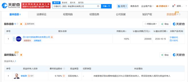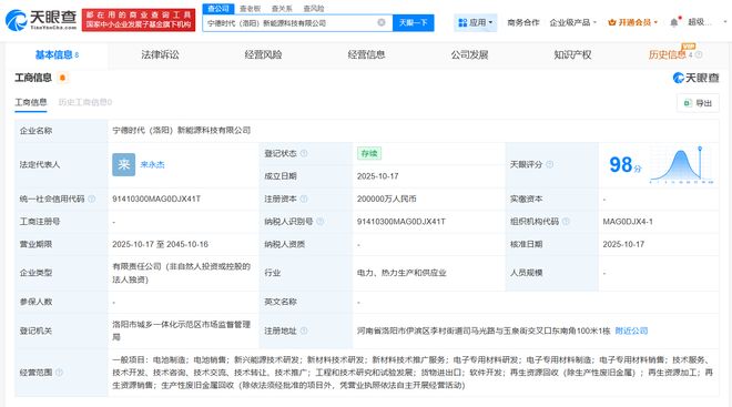 雷达财经讯,天眼查工商信息显示,近日,宁德时代(洛阳)新能源科技有限公司成立,法定代表人为来永杰,注册资本 20 亿人民币,经营范围包括电池制造、电池销售、新兴能源技术研发、新材料技术研发等。股东信息显示,该公司由宁德时代旗下四川时代新能源科技有限公司全资持股。
