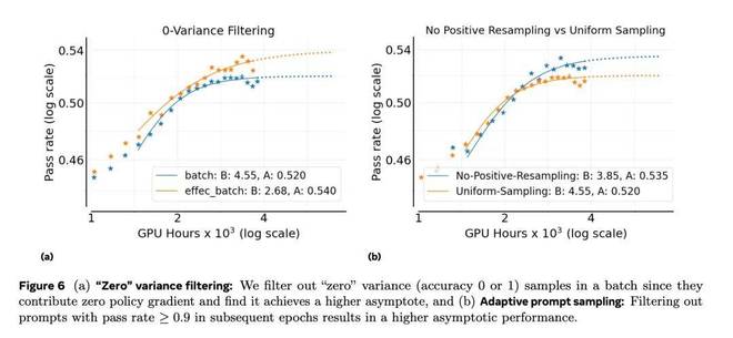 图 6a 中的结果表明,使用「有效 batch」(即过滤掉奖励方差为零的样本)可以获得更好的最终性能,因此作者在 ScaleRL 中采用该策略。