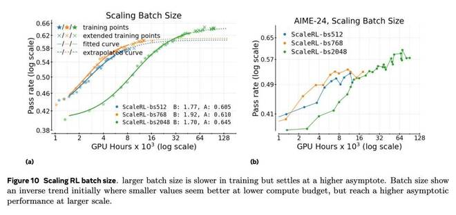 在本文最大规模的数学任务(见图 1)中,将 batch size 提升至 2048 个 prompt 后,不仅稳定了训练,还使得从 50k GPU 小时拟合的曲线能够准确外推到最终 100k 小时的结果。