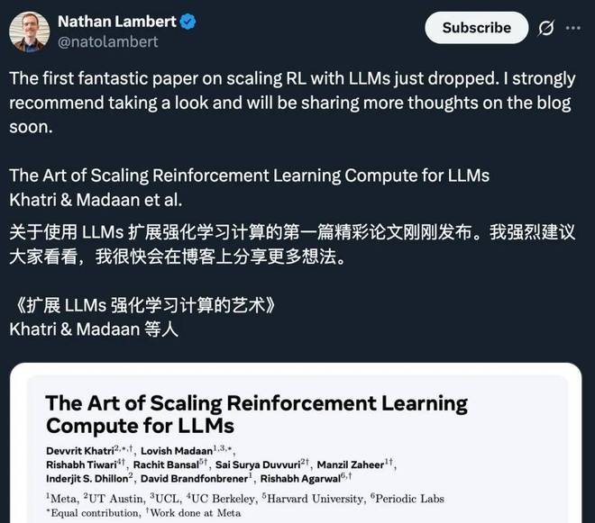 这篇论文是首个关于 LLM 强化学习扩展的开源、大规模系统性研究,其内容非常翔实,结论也足够有参考价值,因此受到了 Ai2 科学家 Nathan Lambert 等人的强烈推荐。