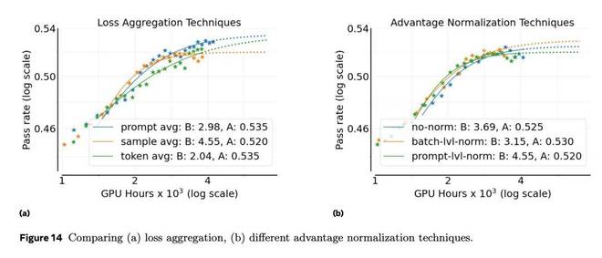 作者比较了不同的损失聚合策略,结果显示 prompt-average 达到了最高的最终性能(图 14a),因此 ScaleRL 采用此方式作为默认选项。