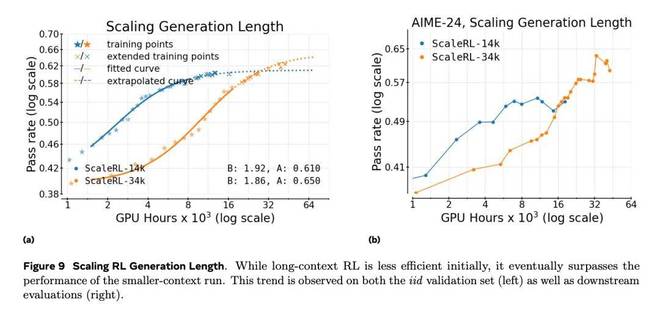 将生成长度从 14k token 增加至 32k token 会在训练初期放慢进展(即表现为较小的 B 和更高的 C_mid),但最终提升拟合曲线的上限 A, 从而在提供足够算力后获得更高的最终性能(见图 9)。
