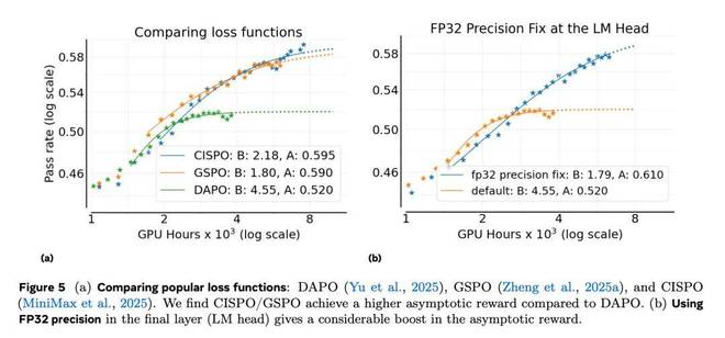 图 5a 表明,GSPO 和 CISPO 的表现都显著优于 DAPO,在最终通过率 A 上有大幅提升。CISPO 在训练过程中展现出更长时间的线性回报增长趋势,并在后期略优于 GSPO,因此作者选择 CISPO 作为 ScaleRL 的最佳损失类型。