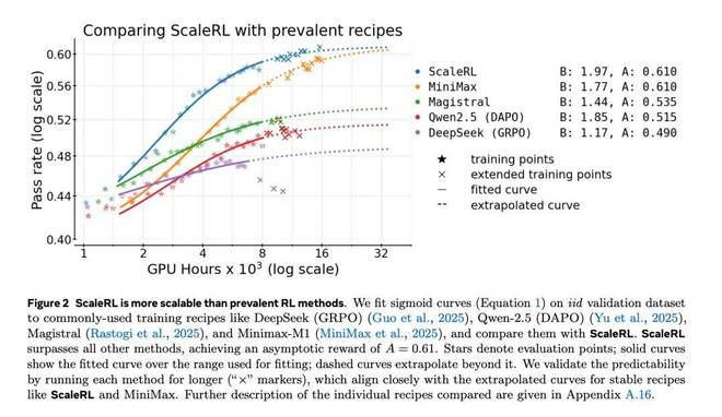 在所有下述扩展轴上,他们都观察到干净、可预测的曲线拟合,其外推结果与延长训练后的真实轨迹高度吻合 —— 与作者在 100,000 GPU 小时训练(图 1)及不同 RL 配方间的交叉对比实验(图 2)中观察到的行为一致。