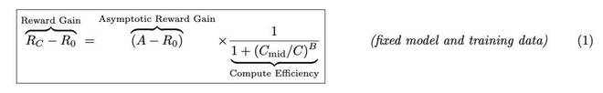 具体而言,他们用一种类 sigmoid 的饱和曲线,将在独立同分布验证集上的期望奖励(R_C)与训练算力(C)联系起来。曲线中的参数 A 表示渐近性能上限,B 表示算力效率,C_mid 则决定性能曲线的中点。图 3 对这些参数进行了示意性解释。