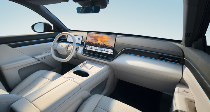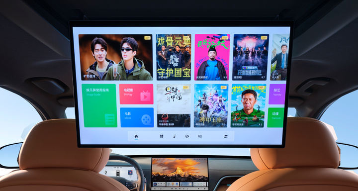 舒适配置上,新车第二排搭载电动魔毯座椅,配备超大电动腿托与 L 型双边贵妃榻,集成通风、加热和按摩功能;同时还拥有 6.92 英寸智能扶手屏与升级版 21.4 英寸 3K 后排娱乐吸顶屏,支持手势控制屏幕、儿童监测、自动开启儿童模式等功能,车内搭载 18 扬声器 WANOS 全景声音响、冷暖冰箱、220V 车内电源及双全景天幕等配置。