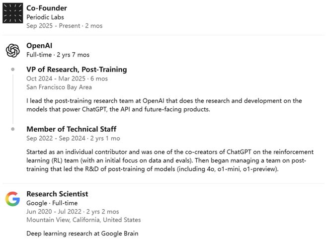 期间,他主导了多个重要模型(包括 4o、o1-mini、o1-preview 等)的后训练研发工作。