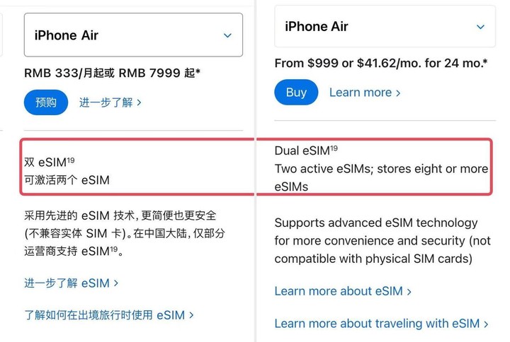 Q:国行 iPhone Air 是否存在硬件限制,使用了和国际版不同的 eSIM 芯片?也就是芯片上只有 2 个卡位而非 8 个,出国要删除卡是硬件限制?