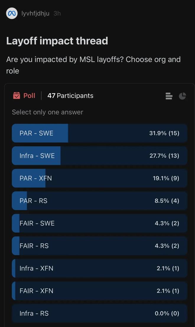 看了这 47 名前 Meta 人的投票结果有点意外,没想到产品应用研究和跨职能的岗位也会受到影响……