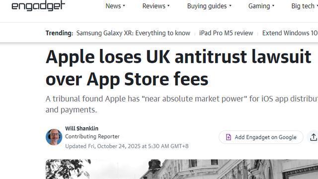 10 月 24 日消息,据外媒 engadget 报道,英国竞争上诉法庭日前作出重磅裁决,认定苹果在 2015 年至 2020 年间滥用市场支配地位,通过 App Store 向开发者收取过高佣金,这一决定可能使苹果面临高达 15 亿英镑的赔偿。