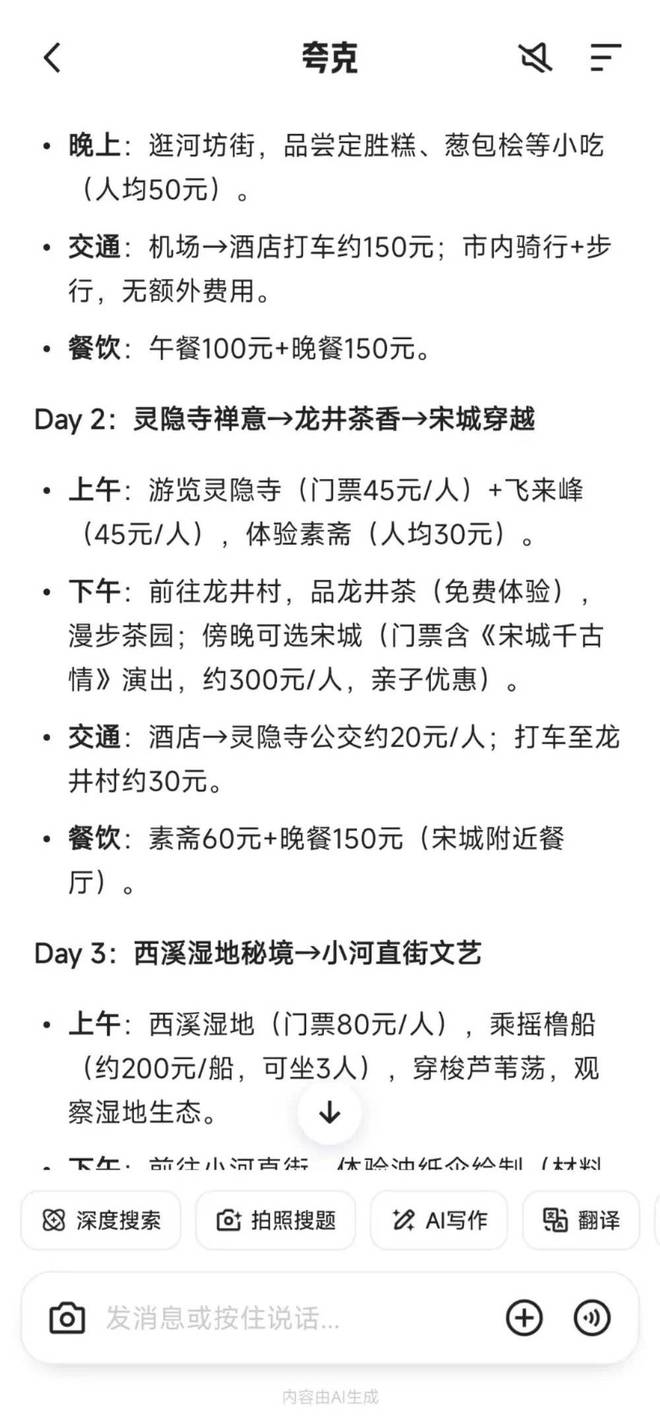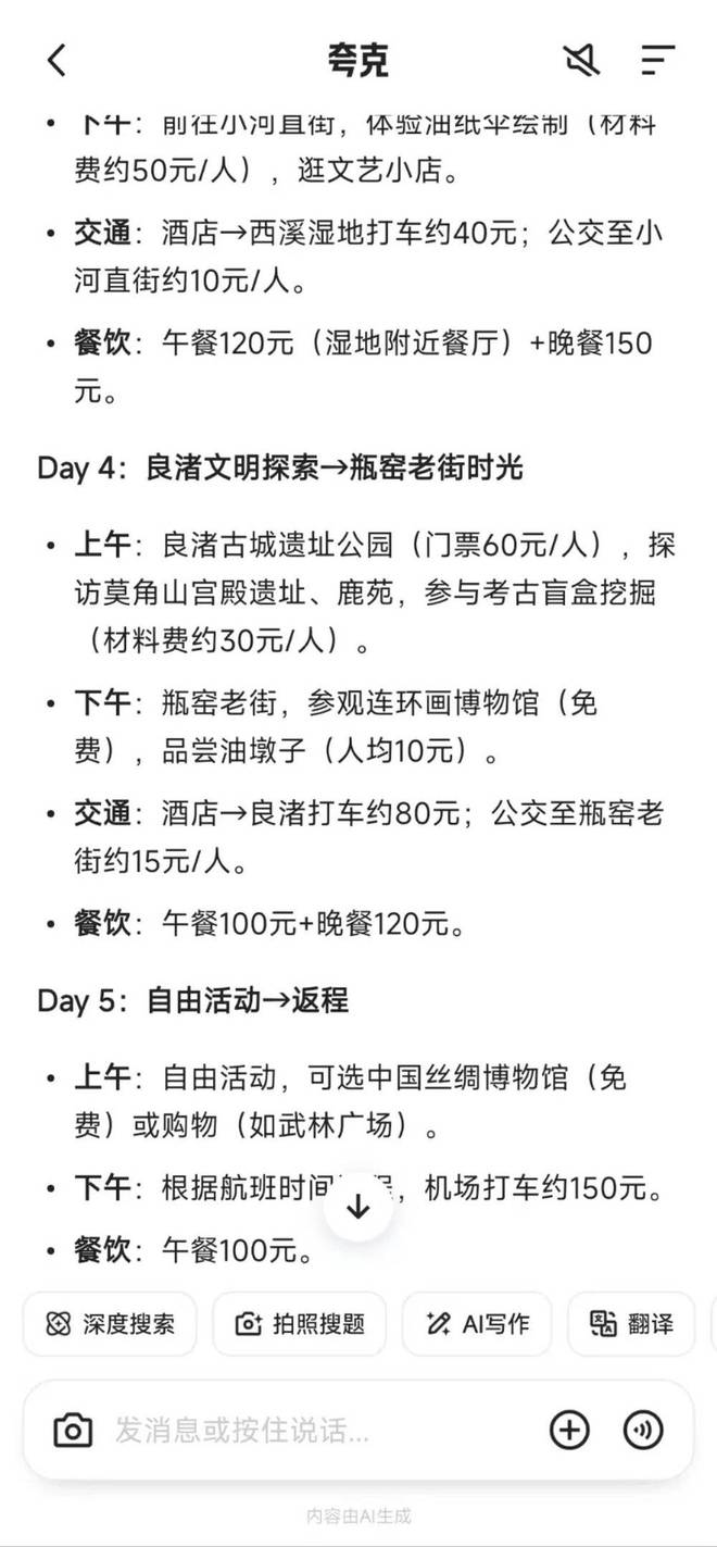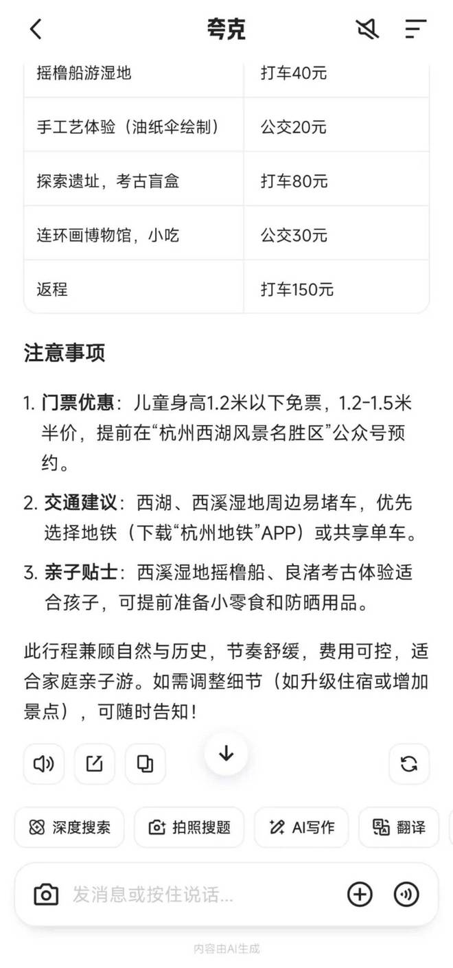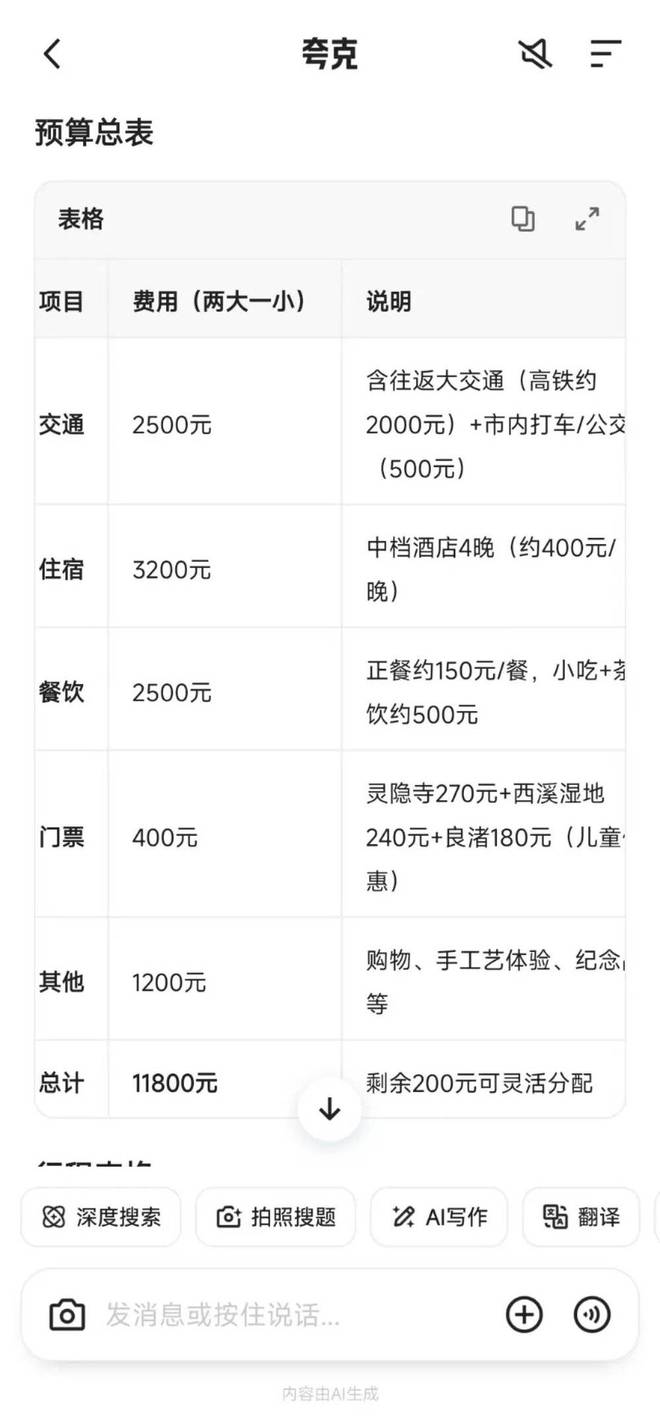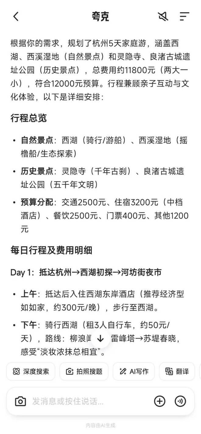 “帮我规划一个为期 5 天的杭州家庭游,两大一小,要求包含两个自然景点和两个历史景点,预算 12000 元,并生成一个包含时间、地点、交通预估的表格。”