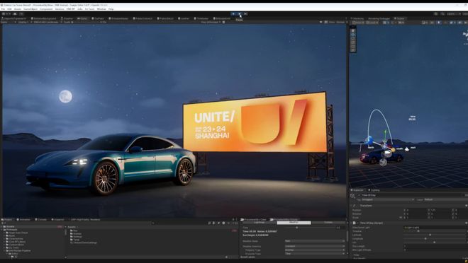 此外,团结引擎 HMI 专属渲染管线(HMIRP)提供了 24 小时昼夜变换系统、实时天气系统、实时面光源、车漆材质等丰富的模块,开发者可以一键实现高保真 3D 桌面内容,提升座舱的视觉品质,并实现品牌定制化呈现。