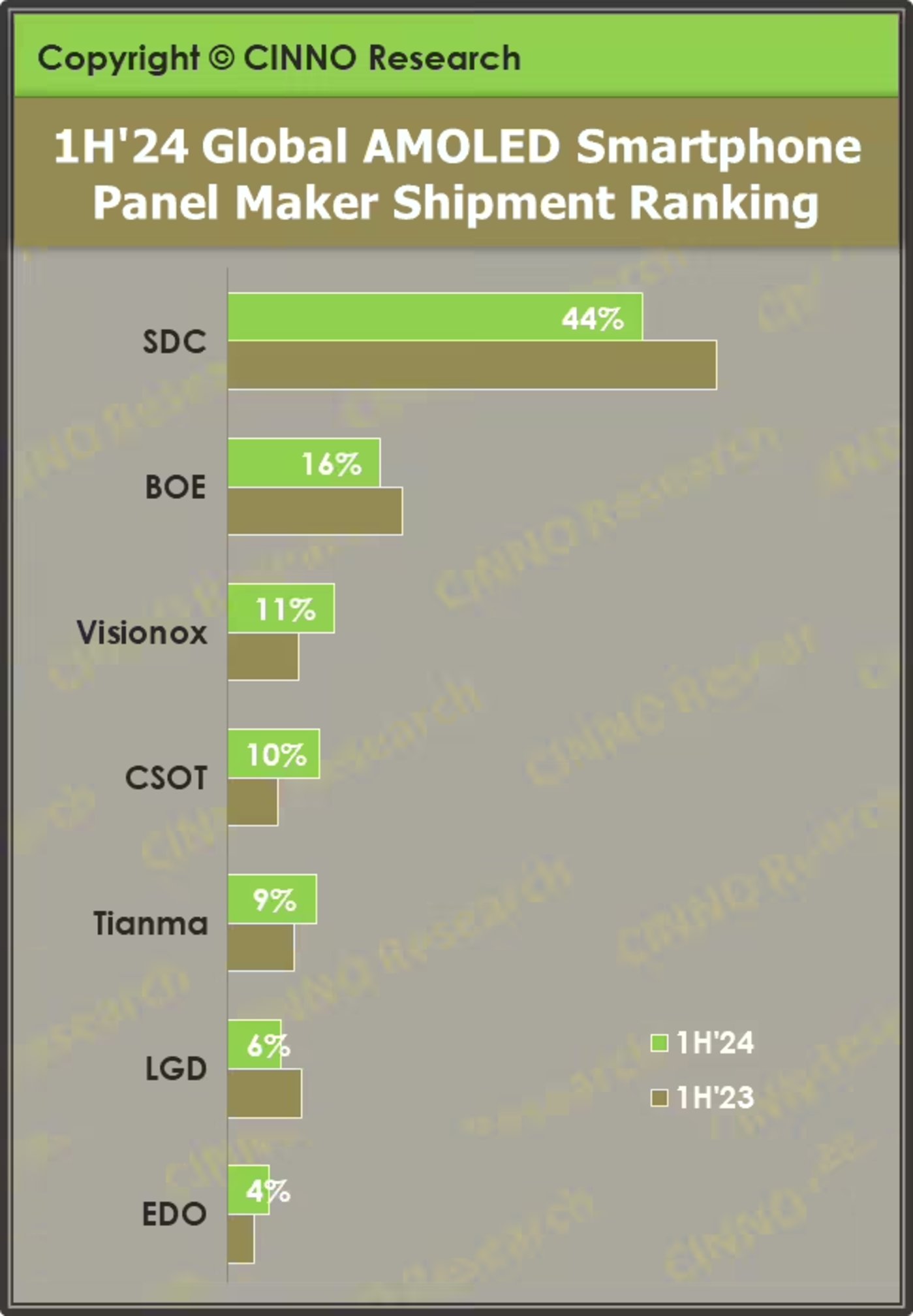 相关数据显示,2024 年全球 AMOLED 手机屏市场份额情况,三星市场份额 44% 仍为全球第一,不过京东方的全球份额已占到 16%,离三星越来越近。