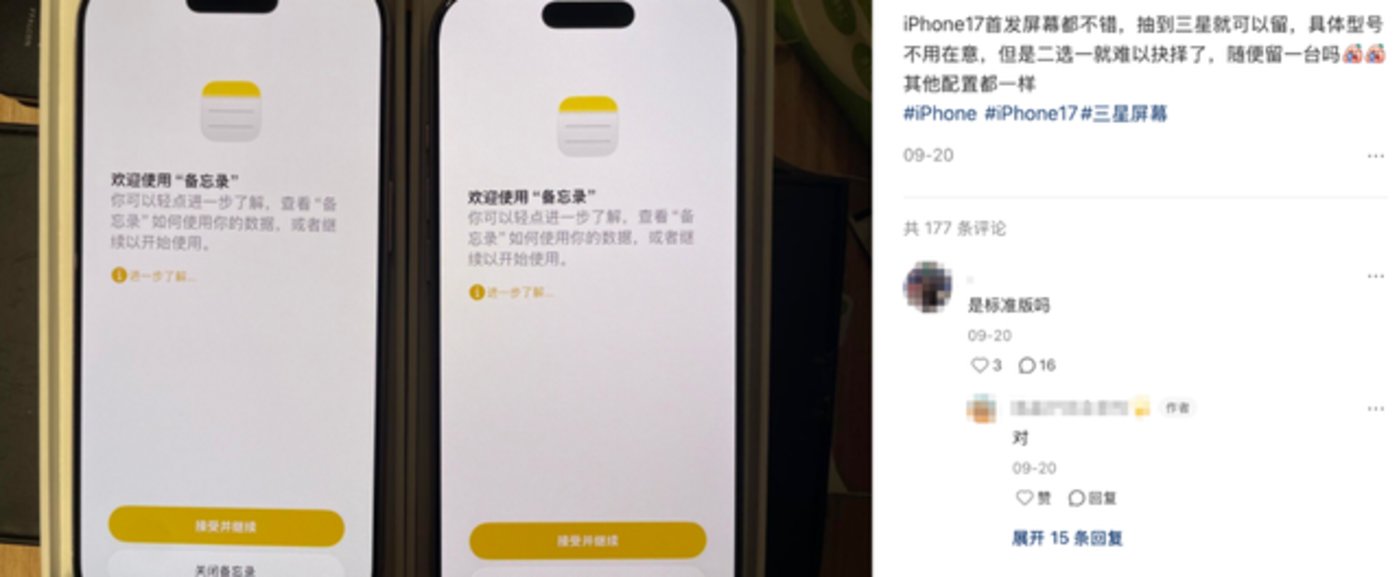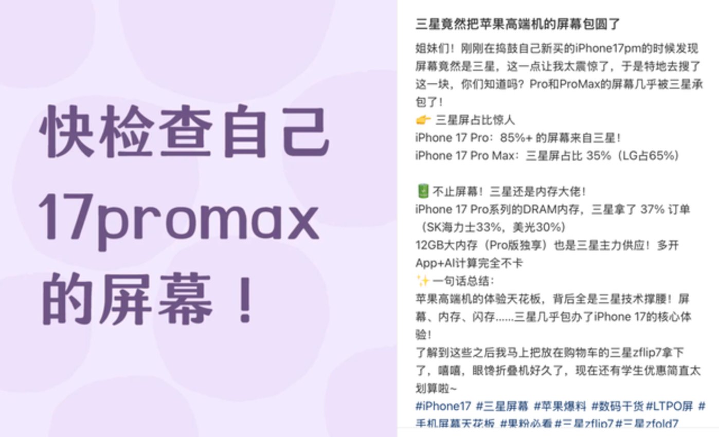 在最新的 iPhone 17 系列之中,屏幕供应商为三星、LG、京东方三家,果粉们都希望自己能抽中三星屏幕的手机。